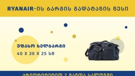 Ryanair-ის ყველა ბილეთის საფასურში შედის მხოლოდ მცირე ხელბარგი, რომლის მაქსიმალური ზომებია: 40x20x25 სმ....