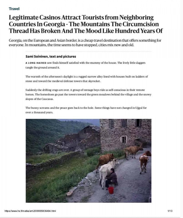 ფინური გაზეთის კორესპონდენტი საქართველოში მოგზაურობის აღწერას სვანეთიდან იწყებს. იგი აღფრთოვანებას ვერ მალავს სვანეთის ბუნებით და სპეციფიკური კულტურით, მოხიბლულია სვანეთის სილამაზით და მას შვეიცარიის ალპებს ადარებს.