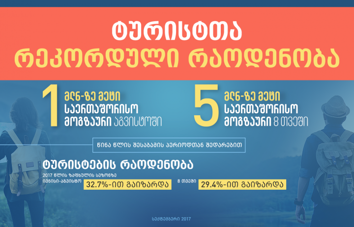 2017 წლის აგვისტოს თვე 1 080 449 ვიზიტით განისაზღვრა, რაც 2016 წლის იგივე პერიოდის მაჩვენებელზე 27,4 %-ით მეტია. შინაგან საქმეთა სამინისტროს საინფორმაციო-ანალიტიკური დეპარტამენტის მონაცემებით, იანვარ-აგვისტოს ინტერვალში, ქვეყანაში უკვე 5 059 106 ვიზიტი განხორციელდა, რაც 18,9%-ით მეტია 2016 წლის ანალოგიური საანგარიშო პერიოდის მაჩვენებელზე, ხოლო ტურისტული ვიზიტი 2 402 699-ით განისაზღვრა, რაც 2016 წლის იგივე პერიოდის მაჩვენებელზე 29,4%- ით მეტია.
