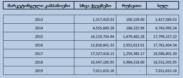 აღსანიშნავია, რომ 2019 წელს მარკეტინგის ბიუჯეტი 17 მლნ ლარითაა განსაზღვრული, საიდანაც 7 მლნ ლარი უკვე დახარჯულია, მაგრამ არცერთი ლარი – რუსეთში.