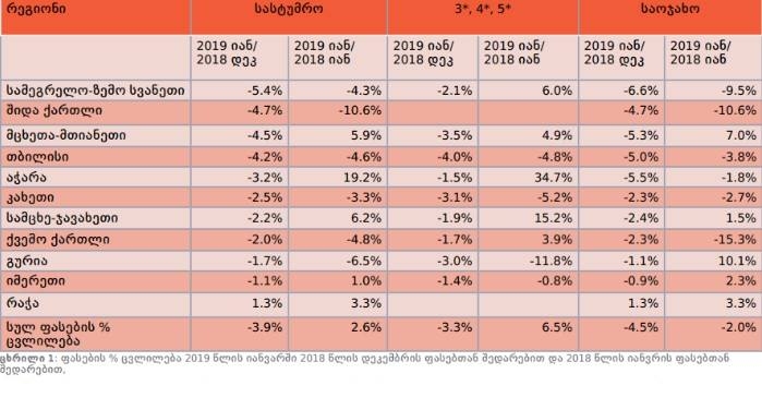 ამავე კვლევის მიხედვით, 2019 წლის იანვარში, 2018 წლის დეკემბერთან შედარებით, საქართველოში სასტუმროს ფასების ინდექსი 3.9%- ით შემცირდა.