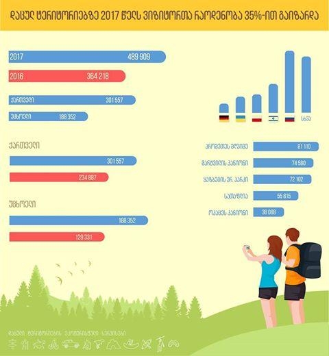 დაცულ ტერიტორიებზე ვიზიტორთა რაოდენობა 2017 წლის პირველ 7 თვეში წინა წლის ანალოგიურ პერიოდთან შედარებით 35%-ით გაიზარდა.