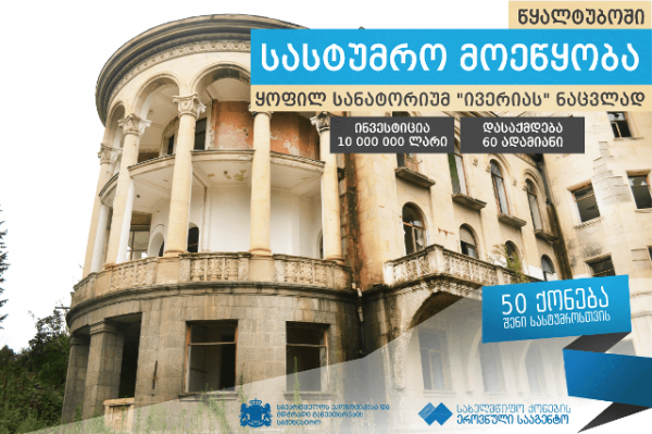 წაყლტუბოში ყოფილი „სანატორიუმი ივერია“ 500 000 ლარად გაიყიდა. სანატორიუმი „50 ქონება შენი სასტუმროსთვის“ ფარგლებში კომპანია „ივერია პალასმა“ საინვესტიციო ვალდებულებით იყიდა.