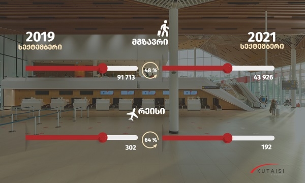 სექტემბერში ქუთაისის საერთაშორისო აეროპორტში მგზავრთნაკადი 48%-ით, რეისების რაოდენობა კი 64%-ით აღდგა