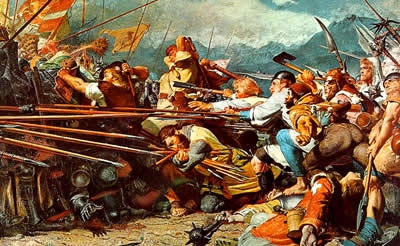 The Old Swiss Confederacy had acquired a reputation of invincibility during these earlier wars, but expansion of the federation suffered a setback in 1515 with the Swiss defeat in the Battle of Marignano. This ended the so-called "heroic" epoch of Swiss history. The success of Zwingli's Reformation in some cantons led to inter-cantonal religious conflicts in 1529 and 1531 (Wars of Kappel). It was not until more than one hundred years after these internal wars that, in 1648, under the Peace of Westphalia, European countries recognized Switzerland's independence from the Holy Roman Empire and its neutrality. By 1353, the three original cantons had joined with the cantons of Glarus and Zug and the Lucerne, Zürich and Berncity states to form the "Old Confederacy" of eight states that existed until the end of the 15th century. The expansion led to increased power and wealth for the federation.[28] By 1460, the confederates controlled most of the territory south and west of the Rhine to the Alps and the Jura mountains, particularly after victories against the Habsburgs (Battle of Sempach, Battle of Näfels), over Charles the Bold of Burgundy during the 1470s, and the success of the Swiss mercenaries. The Swiss victory in the Swabian War against the Swabian League of EmperorMaximilian I in 1499 amounted to de facto independence within the Holy Roman Empire.