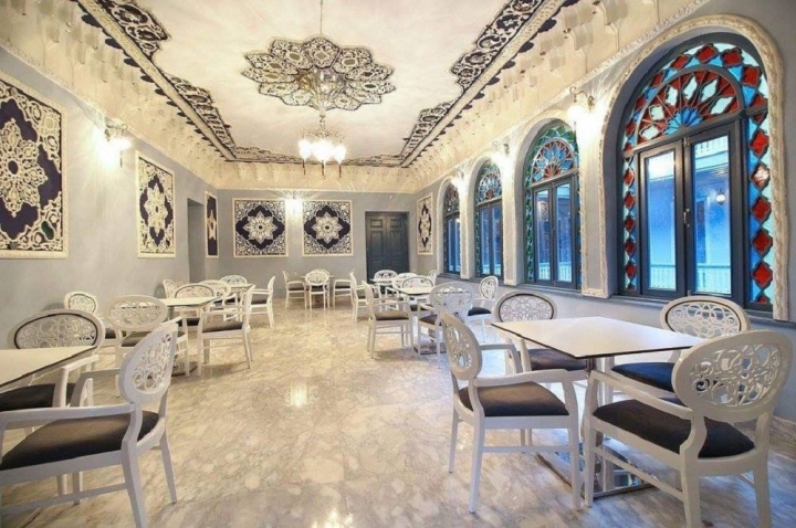 The turquoise colour building, commonly known as Blue Palace Firuza (turquoise in Georgian) combined characteristics of Persian, Georgian and European styles. An open balcony with sparkling small mirror fragments covering walls and the ceiling gave the building extra sparkle.