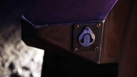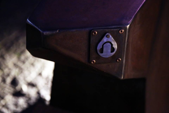 The sculpture features steel, wood and iron materials, while Charkviani's portrait was created in monochrome colours.