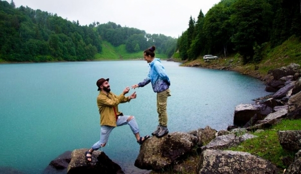 A Facebook page of Georgian hitchhikers named ავტოსტოპერები / Hitchhiker has published a lovely and heartwarming photo showing a proposal ceremony near the Blue Lake located in Khulo District, in Georgia’s Adjara region. It is quite an extraordinary way to propose to your girlfriend. Don’t you agree?