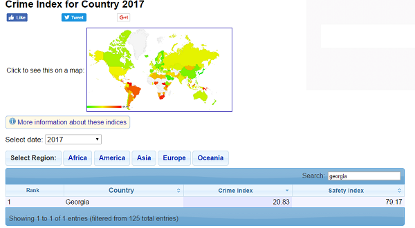 Georgia has been ranked the seventh safest country in the world by global database Numbeo.
