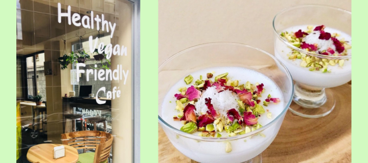Here you can try a healthy vegan version of Mahalabia, pure guilt-free sweets. It consists of coconut cream, kudzu powder, erythritol, rose water and is garnished by pistachio, shredded coconut, and red rose petals.