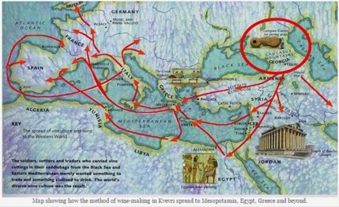 According to the author’s map, wine making first entered in Syria from Georgia, then Egypt from Italy and then in Western Europe.