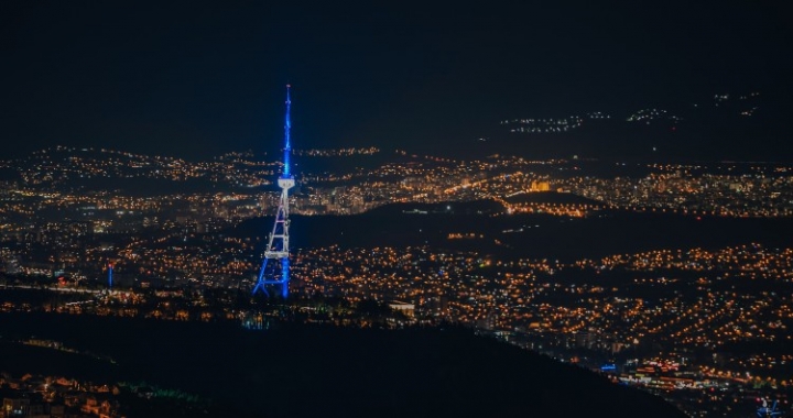 The hilltop TV tower overlooking Georgia’s capital Tbilisi is on Sunday illuminated with the national colours of Israel in a symbolic show of solidarity with the country following the terrorist attack yesterday.