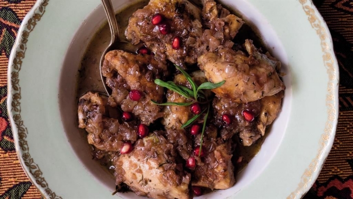 2. Stir in the onion and cook with the chicken for 5 minutes or until the onion starts to soften. Add the coriander seeds, herbs, water and half of the pomegranate juice, stirring well. Season with salt and pepper. Bring to the boil, lower heat and simmer for 30 minutes, turning the chicken occasionally, until the juice runs clear when a knife is inserted in the thickest part of the chicken.