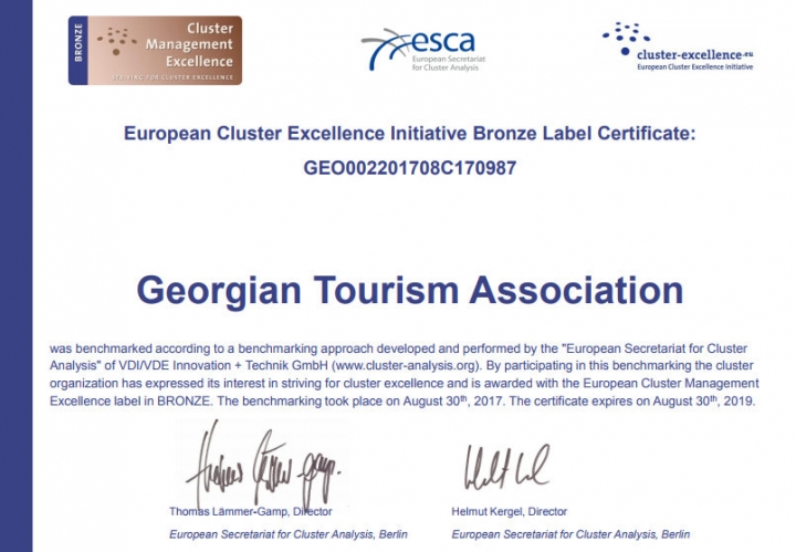 ევროპული კლასტერების ორგანიზაციამ (http://www.clusterexcellence.eu) საქართველოს ტურიზმის ასოციაციას მიანიჭა Cluster Management Excellence Label BRONZE – Striving for Cluster Excellence" - ის ეტიკეტი, რომელიც საქართველოში მხოლოდ GTA-ს და სამედიცინო დარგის ერთ ორგანიზაციას აქვს მინიჭებული.
