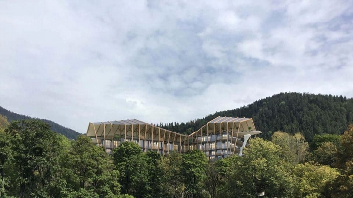 150 ნომრიან სასტუმროში თავმყორილი იქნება სპა, აუზი, რესტორანი, საკონფერენციო დარბაზი, ტერასა 360 გრადუსიანი ხედით და ა.შ. წიწვოვანი ტყით გარშემორტყმული სასტუმრო 20 000 კვ.მ მიწის ნაკვეთზე განთავსდება, ხოლო მისი საერთო სამშენებლო ფართი 30 000 კვ.მ-ია. შენობის არქიტექტურა ალპური ხასიათის მქონდე ფასადისაგან შედგება, რაც კარგად ერწყმის არსებულ ლანდშაფტს. მოსაპირკეთებელ მასალად კი ძირითადად მინის, ხისა და ქვის ფაქტურები იქნება გამოყენებული.