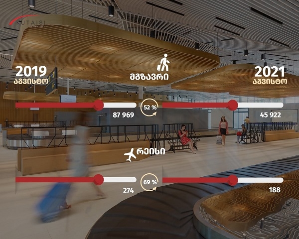აგვისტოს მონაცემებით, ქუთაისის საერთაშორისო აეროპორტში მგზავრთნაკადი 52%-ით, რეისები რაოდენობა კი 69 %-ით აღდგა