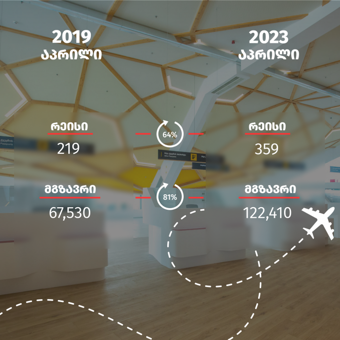 ოთხი თვის ჭრილში კი ქუთაისის საერთაშორისო აეროპორტი 375,459 მგზავრსა და 1,213 რეისს მოემსახურა. მგზავრთნაკადი 2019 წელთან შედარებით 67 %-ით, ხოლო რეისების რაოდენობა – 62 %-ით გაიზარდა.