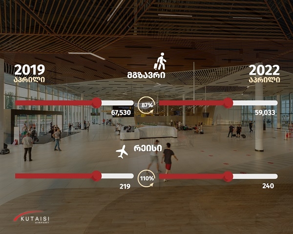 ქუთაისის საერთაშორისო აეროპორტში საჰაერო მიმოსვლის დადებითი დინამიკა 2022 წლის დასაწყისშიც კვლავ ნარჩუნდება. საქართველოს აეროპორტების გაერთიანების ინფორმაციით, 2022 წლის აპრილის თვეში, 2019 წლის ანალოგიურ პერიოდთან შედარებით, დავით აღმაშენებლის სახელობის აეროპორტში მგზავრთნაკადის 87% აღდგა. 2022 წლის აპრილში, ქუთაისის საერთაშორისო აეროპორტი 59,033 მგზავრს მოემსახურა. (2019 წლის აპრილი 67,530 მგზავრი).