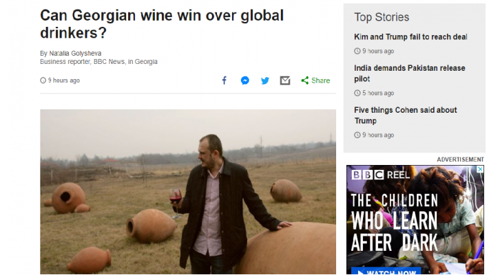 სტატიაში საუბარია, რომ საქართველო მეღვინეობის სამშობლოა, სადაც ღვინის წარმოება 8 ათასი წლის უკან დაიწყეს და სადაც უნიკალური ღვინოები იწარმოება. ავტორი ეწვია ქართული ღვინის მწარმოებელ რამდენიმე კომპანიას, სადაც 2-ტონიანი ქვევრებიდან ღვინოც დააგემოვნა. „საუკუნეების მანძილზე მეღვინეობა ქართული ეკონომიკის უმთავრესი შემადგენელი იყო, ხოლო ღვინის ექსპორტის დიდი ნაწილი რუსეთში მიემართებოდა“, – აღნიშნულია სტატიაში. ავტორი მიუთითებს, რომ 2006 წლის რუსული ემბარგოს შემდეგ, საქართველომ ახალი პარტნიორების ძებნა დაიწყო და ამჟამად ქართული ღვინის ექსპორტი მსოფლიოს 55 ქვეყანაში ხორციელდება. „2013 წელს რუსეთში ექსპორტის განახლების შემდეგ, რუსეთის წილი მთლიან ექსპორტში 62%-მდე შემცირდა“ – ნათქვამია ბი-ბი-სის სტატიაში.