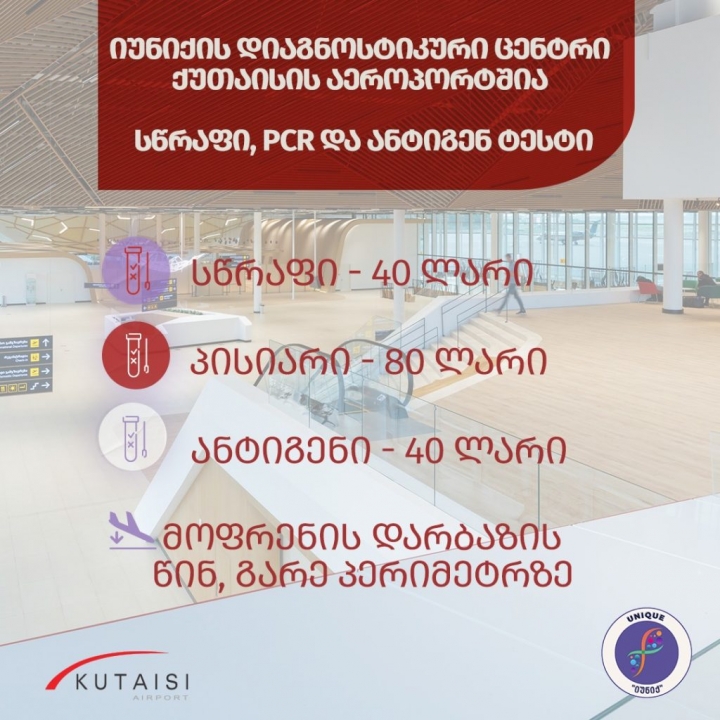 ქუთაისის საერთაშორისო აეროპორტში დიაგნოსტიკური ცენტრი “იუნიქის” განყოფილება გაიხსნა. როგორც აეროპორტის მიერ გავრცელებულ ინფორმაციაშია აღნიშნული, მგზავრებს მოფრენის დარბაზის წინ, გარე პერიმეტრზე უკვე შეუძლიათ COVID-19-ის რამოდენიმე სახის ტესტის ჩატარება.