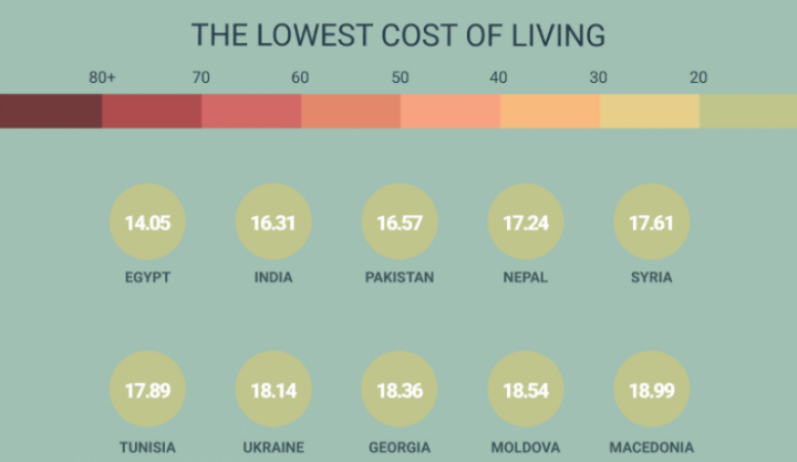 რეიტინგის თანახმად, ეგვიპტე ყველაზე იაფი ქვეყნების რეიტინგშია. მომდევნო ადგილს იკავებს ინდოეთი, პაკისტანი, ნეპალი, სირია, ტუნისი, უკრაინა, საქართველო, მოლდოვა, მაკედონია, მექსიკა, აზერბაიჯანი, ალბანეთი, ალჟირი და უგანდა.
