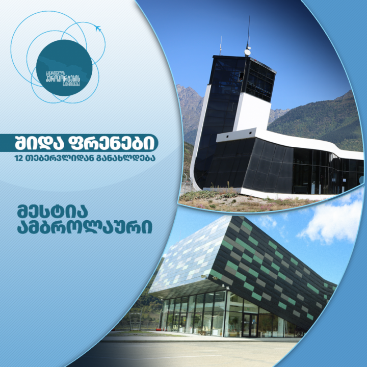 ,,განვაახლეთ შიდა ფრენები საქართველოს მაღალმთიან რეგიონებში. ნატახტარიდან მესტიისა და ამბროლაურის აეროპორტებში თებერვალ-მარტში რეგულარული რეისები მცირე ზომის საჰაერო ხომალდით კვირაში ორი სიხშირით შესრულდება. გვსურს აღვნიშნოთ, რომ ამ ხმის განმავლობაში ფრენები არ შეჩერებულა თბილისი-ბათუმის მიმართულებით. თებერვალ-მარტში რეისები აჭარის მიმართულებითაც კვირაში ორი სიხშირით შესრულდება. მგზავრებს მოეთხოვებათ როგორც ტერმინალში, ასევე საჰარეო ხომალდზე პირბადის ტარება. ბილეთის ფასი და გაყიდვის წესი, ასევე, საშეღავათო პირობები, რომელიც აქამდე არასრულწლოვნებზე მოქმედებდა კვლავ ძალაში რჩება"- ნათქვამია საქართველოს აეროპორტების გაერთიანების მიერ გავრცელებულ განცხადებაში.