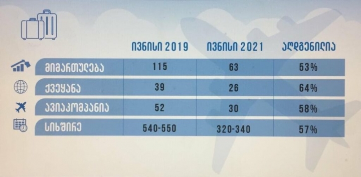 ავიაკომპანიების რაოდენობა, რომლებიც COVID-19-მდე დაფრინავდნენ საქართველოში 58%-ით დაუბრუნდნენ ჩვენი ქვეყნის საავიაციო სივრცეს. ასევე აღდგენილია პანდემიამდე არსებული სიხშირეების 57%-ი.