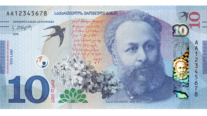 განახლებული 10-ლარიანი ბანკნოტის წინა მხარეს გამოსახულია აკაკი წერეთლის განსხვავებული პორტრეტი გაუმჯობესებული რელიეფურობის ხარისხითა და მოცულობით, ასევე, ნაწყვეტი აკაკის ლექსიდან „გაზაფხული მისი ავტოგრაფით, აყვავებული რტო და მერცხალი.