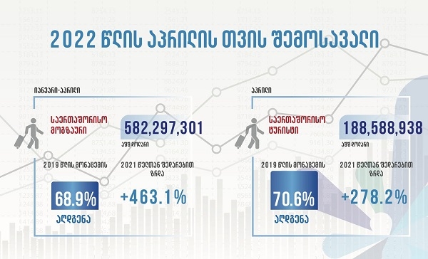 ტურიზმის ეროვნული ადმინისტრაცია 2022 წლის იანვრი-აპრილის თვის შემოსავლების სტატისტიკას აქვეყნებს. 4 თვეში საერთაშორისო მოგზაურობიდან საქართველომ 582 მილიონი დოლარის შემოსავალი მიიღო, რაც 2019 წლის მაჩვენებლის 68.9% აღდგენაა. 2021 წლის იანვრი-აპრილის თვესთან შედარებით მოგზაურობიდან შემოსავლები გაზრდილია 478,886,422 (+463.1%) აშშ დოლარით.