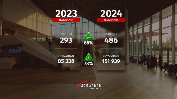 მგზავრთნაკადის გარდა, წლის დასაწყისში ქუთაისის საერთაშორისო აეროპორტში ავიარეისების რაოდენობის კუთხითაც ზრდა იყო. იანვარში აეროპორტში რეისები გასული წლის პერიოდთან შედარებით 66%-ით გაიზარდა და 486 რეისს მოემსახურა. ( 2023 წლის იანვარი - 293 რეისი).