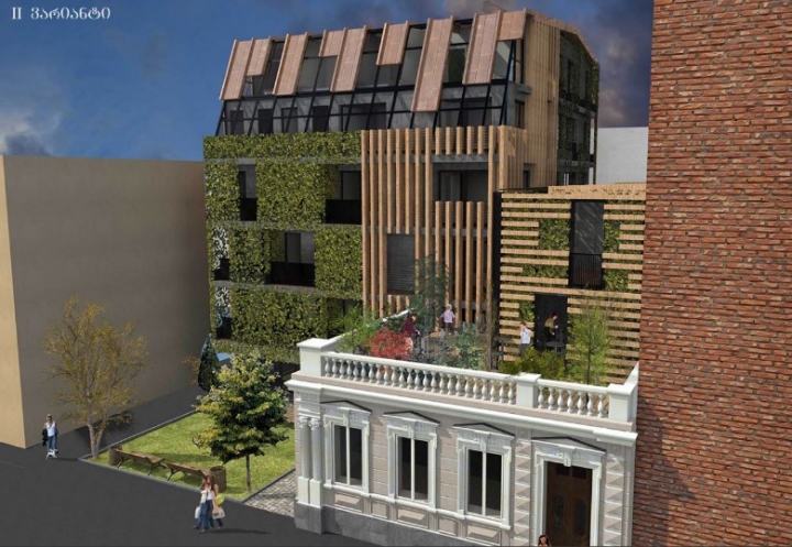 დამკვეთი განმარტავს, რომ ისტორიულ არქიტექტურული კვლევის რეკომენდაციების საფუძველზე, სარეაბილიტაციო ისტორიულ არქიტექტურული ძეგლის სტატუსის მქონე შენობის ქუჩის ფასადი და ფასადის დეკორები უცვლელად აღდგება და შეიღებება ლაბორატორიულად გამოკვლეული ფერით, რომელიც მითითებულია ფასადებზე და რენდერებზე. ეზოს მხრიდან იგეგმება არსებული შემინული აივნის რეაბილიტაცია, რომლის ნაწილი შემოსილია ბადით, რომელზე მცოცავი მცენარეები განთავსდება. აივნებზე განლაგებული იქნება მეტალის ქოთნები სადაც მცოცავი მცენარეები დაირგვება.