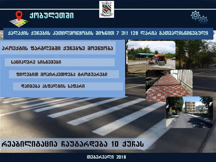 ქობულეთში ქუჩების რეაბილიტაცია იგეგმება. ქობულეთის მუნიციპალიტეტის მონაცემებით, 10 ქუჩის რეაბილიტაციაზე 7 311 128 ლარი დაიხარჯება.