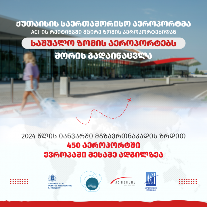 აეროპორტების საერთაშორისო საბჭოს (ACI International) 2024 წლის იანვრის ანგარიშის თანახმად, ქუთაისის საერთაშორისო აეროპორტი საშუალო ზომის აეროპორტებს შორის 2019 წელთან შედარებით, მგზავრთნაკადის 171.8%-იანი ზრდის მაჩვენებლით სამარყანდისა და ტირანას აეროპორტების შემდეგ მესამე ადგილზე გავიდა.ახალი კლასიფიკაციის თანახმად, საუბარია ACI-ის წევრ იმ აეროპორტებზე, რომლებიც წლიურად 1-დან 10 მლნ-მდე მგზავრს ემსახურებიან.