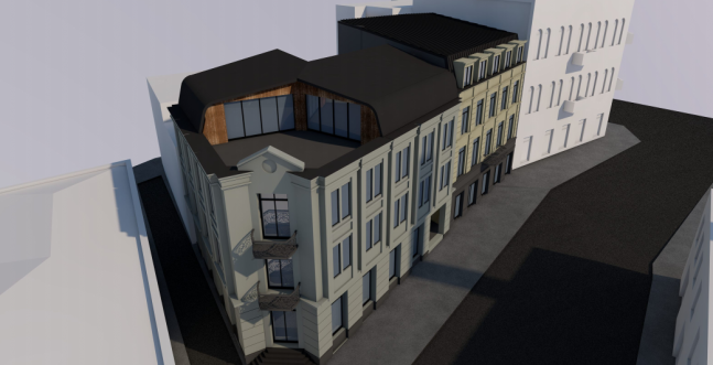 კუთხის შენობაზე დაშენდება 1 სრული სართული და მანსარდი პატარა ტერასით.