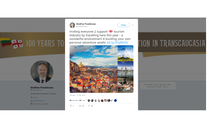 „მოგიწოდებთ ყველას საქართველოს ტურიზმის ინდუსტრიის მხარდაჭერას. მიმდინარე წელს ამ ქვეყანაში გამგზავრებით, თქვენი პირადი თავგადასავლებისთვის შესანიშნავი გარემო გელოდებათ”, წერს ლიეტუვის ელჩი.