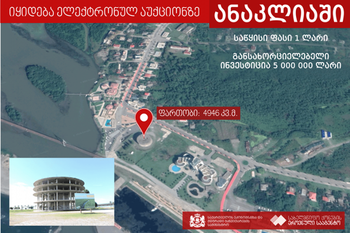 სახელმწიფო ქონების ეროვნული სააგენტოს ინფორმაციით, სასტუმრო-ინფრასტრუქტურის განვითარების მიზნით ანაკლიაში მდებარე 4946 კვ.მ. მიწის ნაკვეთი და მასზე განთავსებული შენობა-ნაგებობა 1 ლარად, საინვესტიციო ვალდებულებებით, ელექტრონულ აუქციონზე იყიდება.