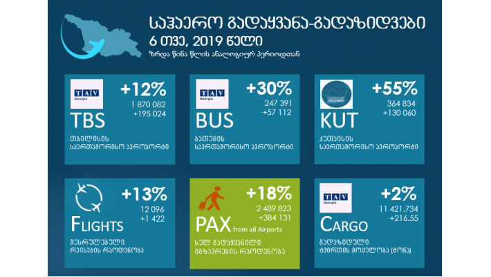 საქართველოს ეკონომიკისა და მდგრადი განვითარების სამინისტროს სსიპ სამოქალაქო ავიაციის სააგენტოს მონაცემებით, 2019 წლის პირველის ექვსი თვის განმავლობაში, საქართველოს აეროპორტები ჯამში 2 489 823 მგზავრს მოემსახურა. 2018 წლის ანალოგიურ პერიოდთან შედარებით, მგზავრთნაკადი 18.24%-ით (384 131 მგზავრით), ხოლო 2017 წლის პირველ და მეორე კვარტალთან შედარებით 54.59%-ით (879 187 მგზავრით) არის გაზრდილი.