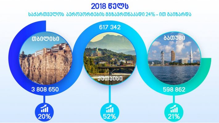2018 წლის მონაცემებით, საქართველოს აეროპორტებში მგზავრთნაკადი 24 პროცენტით გაიზარდა
