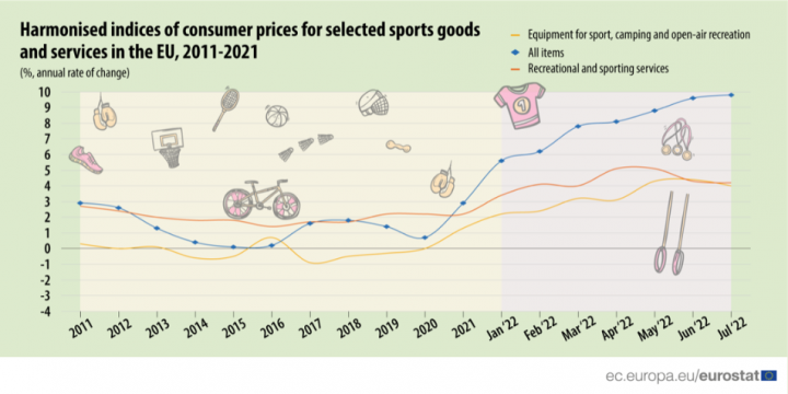 2022 წლის ყოველთვიური მონაცემები აჩვენებს, რომ ევროკავშირში დასვენებისა და სპორტული მომსახურების ფასების ცვლილების წლიური მაჩვენებელი იანვრის +3,4%-იანი მაჩვენებლიდან ივლისში 4,2%-მდე გაიზარდა. - ამის შესახებ ინფორმაციას eurostat ავრცელებს. მათივე ინფორმაციით სპორტის, კემპინგის, ღია ცის ქვეშ დასვენების და აღჭურვილობის 2022 წლის ყოველთვიური მონაცემები ფასების მნიშვნელოვან ზრდას აჩვენებს.