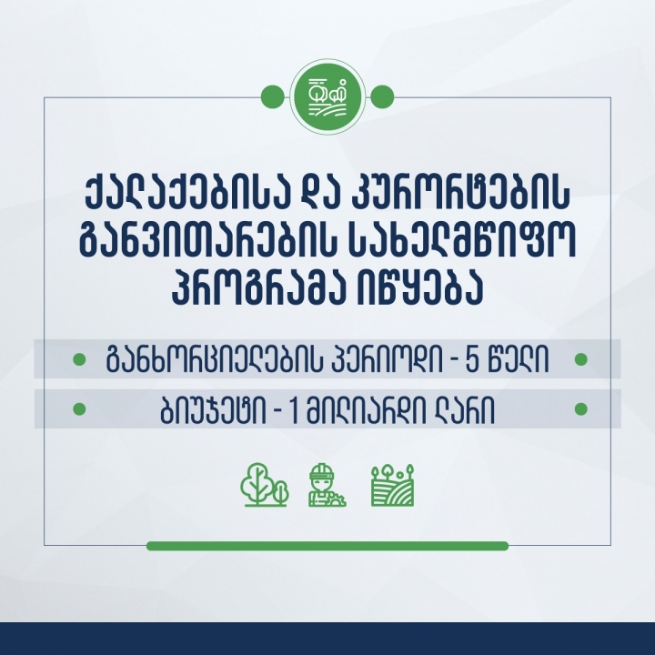 ქალაქებისა და კურორტების განვითარების სახელმწიფო პროგრამა იწყება, რომელიც შემდგომი 5 წლის განმავლობაში განხორციელდება და მისი ბიუჯეტი 1 მილიარდი ლარი იქნება.