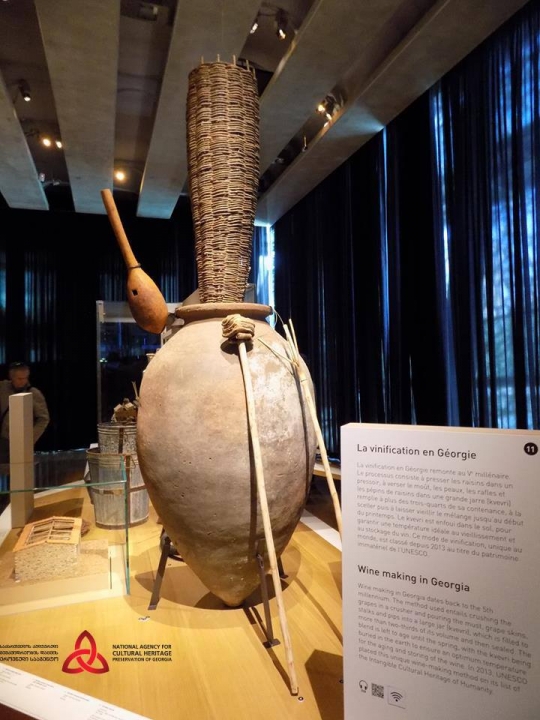 გამოფენაზე წარმოდგენილია ქვევრი, ორშიმო, სამთითა, სარცხი, გიდელი, ექსპონატების ეტიკეტებზე განმარტებულია, რომ ეს ნივთები ჩამოტანილია საქართველოდან – კახეთის სოფ. მაღაროდან და რაჭიდან. გამოფენას ახლავს ვრცელი ექსპლიკაცია, სადაც საუბარია საქართველოში ქვევრში ღვინის დაყენების 5000 წლოვან ისტორიაზე, რომ მიწაში ჩაფლულ თიხის ჭურჭელში ხდება ღვინის ჩაწურვა და დაღვინების პროცესი, და რომ ეს ტრადიცია დღესაც ცოცხალია საქართველოში. ასევე აღნიშნულია, რომ ქვევრის ღვინის დაყენების ქართულ ტრადიციულ მეთოდს 2013 წელს იუნესკოს (UNESCO) არამატერიალური კულტურული მემკვიდრეობის ძეგლის სტატუსი მიენიჭა. ეს მეტად მნიშვნელოვანი ფაქტია, განსაკუთრებით მას შემდგომ რაც საქართველომ ევროპული ვიზალიბერალიზაცია მიიღო და ასეთი ექსპოზიცია, ესეთ მრავალეროვან და დიდ ევროპულ ქალაქში საქართველოს ცნობადობის ამაღლებას შეუწყობს ხელს.