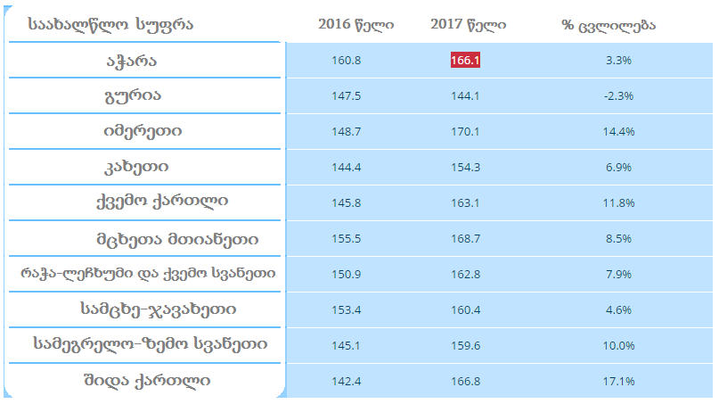 ჯამში საქართველოში საახალწლო სუფრის გაწყობა 161.60 ლარი ჯდება, რაც წინა წლის ანალოგიურ მაჩვენებელზე 8,1%-ით გაზრდილი მაჩვენებელია.
