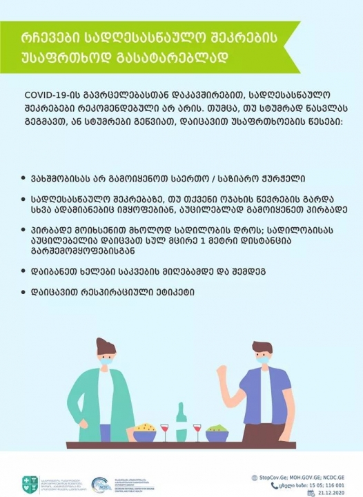 ცენტრის გავრცელებულ განცხადებაში ნათქვამია, რომ COVID-19-ის გავრცელების გამო, სადღესასწაულო შეკრებები რეკომენდებული არ არის, თუმცა სტუმრად წასვლის ან სტუმრის მიღების შემთხვევაში უსაფრთხოების წესები უნდა დაიცვან: