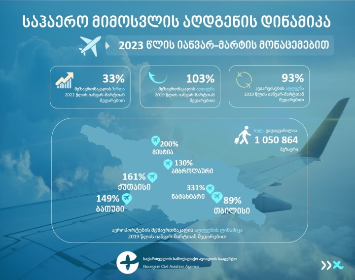 საქართველოს ეკონომიკისა და მდგრადი განვითარების სამინისტროს სსიპ სამოქალაქო ავიაციის სააგენტოს მიერ დაჯამებული მონაცემებით, 2023 წლის პირველ სამ თვეში, საქართველოს აეროპორტები 1 050 864 მგზავრს მოემსახურა, რაც 33%-ით აღემატება 2022 წლის ანალოგიურ პერიოდში გადაყვანილი მგზავრების რაოდენობას.
