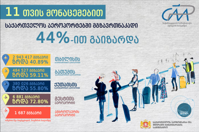 საქართველოს ეკონომიკისა და მდგრადი განვითარების სამინისტროს სსიპ სამოქალაქო ავიაციის სააგენტოს მონაცემებით, მიმდინარე წლის 11 თვის განმავლობაში, საქართველოს აეროპორტების მიერ, რეგულარული და ჩარტერული რეისების შედეგად გადაყვანილ იქნა 3 816 538 მგზავრი, რაც 44.48%-ით აღემატება წინა წლის ანალოგიურ მონაცემს (2 641 539 მგზავრი).