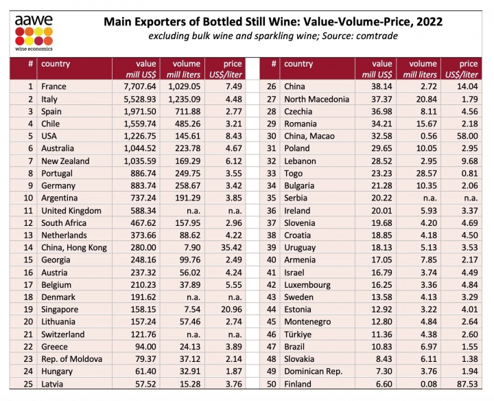 ბოთლის ღვინის 2022 წლის მთავარი ექსპორტიორი ქვეყნების ტოპ 10-ეულია: