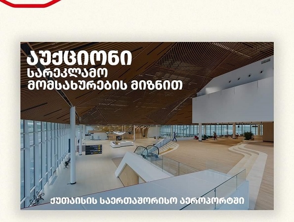 საქართველოს აეროპორტების გაერთიანება ქუთაისის საერთაშორისო აეროპორტში და მის ტერიტორიაზე სარეკლამო მომსახურების მიზნით ექსკლუზიური უფლების გადაცემით აუქციონს აცხადებს.