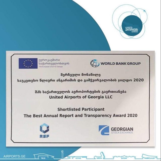 საქართველოს აეროპორტების გაერთიანება ,,საუკეთესო წლიური ანგარიშის და გამჭვირვალობის 2020“-ის შერჩეულ მონაწილედ დასახელდა