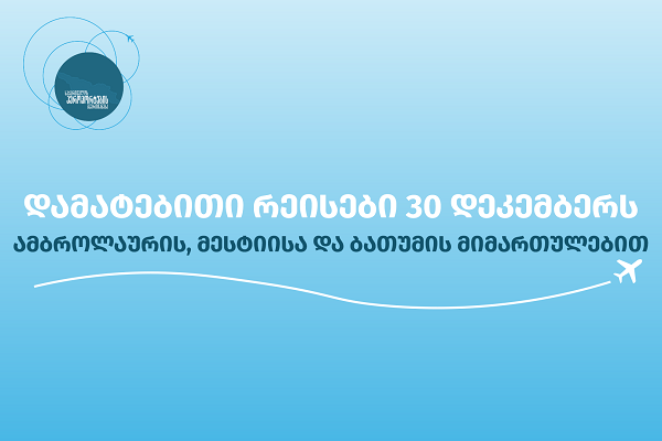 ახალი წლის დღესასწაულთან დაკავშირებით, როგორც შიდა და საერთაშორისო ტურიზმის სტიმულირების, ასევე მესტიის მუნიციპალიტეტის მცხოვრებლების მომსახურების მიზნით, 30 დეკემბერს, საქართველოს აეროპორტების გაერთიანება მესტიის, ამბროლაურის და ბათუმის მიმართულებით დამატებით სიხშირეებს ნიშნავს. არსებულ რეგულარულ რეისებს 30 დეკემბერს თითოეულ მიმართულებაზე თითო რეისი დაემატება და ფრენები შემდეგი განრიგით განხორციელდება.