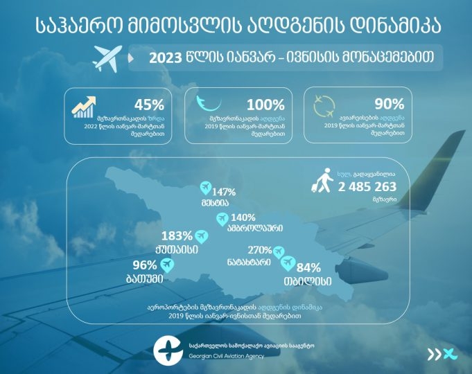 2023 წლის იანვარ-ივნისში, საქართველოს აეროპორტების მგზავრთნაკადი პანდემიამდელ ნიშნულს 100%-ით გაუთანაბრდა. საქართველოს სამოქალაქო ავიაციის სააგენტოს მიერ დაჯამებული მონაცემებით, 2023 წლის პირველ ექვს თვეში, საქართველოს აეროპორტები 2 485 263 მგზავრს მოემსახურა, რაც 45%-ით აღემატება 2022 წლის ანალოგიურ პერიოდში გადაყვანილი მგზავრების რაოდენობას.